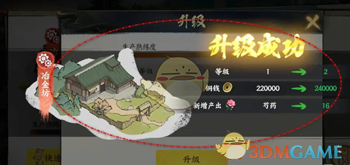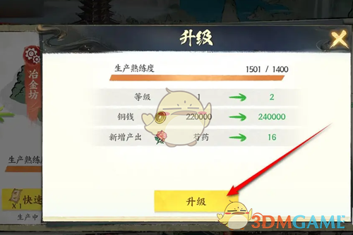 3、在升级页面,可以看到升级后的熟练度、等级、铜钱、新增产出等属性;