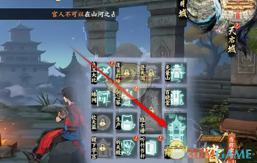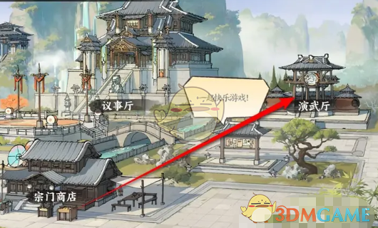 2、展开功能菜单后,点击宗门进入,在宗门页面点击靠右上角的演武厅。