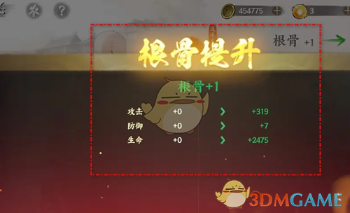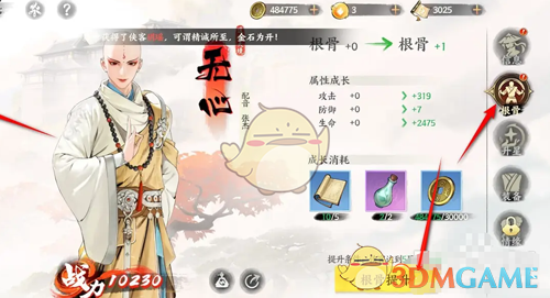 4、最后花费指定的材料完成提升,即可提升侠客的根骨,增加各方面的属性。