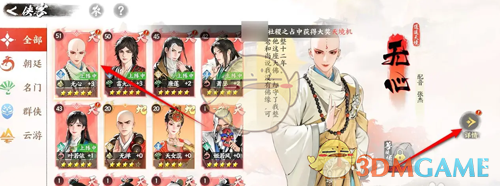 2、接着在侠客页面,点击右侧的详情进入侠客培养页面;