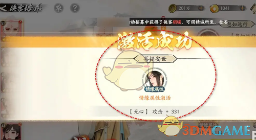 4、最后我们将该侠客的情缘属性激活后,即可获得攻击等属性的加成效果;