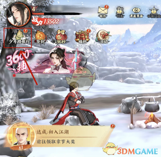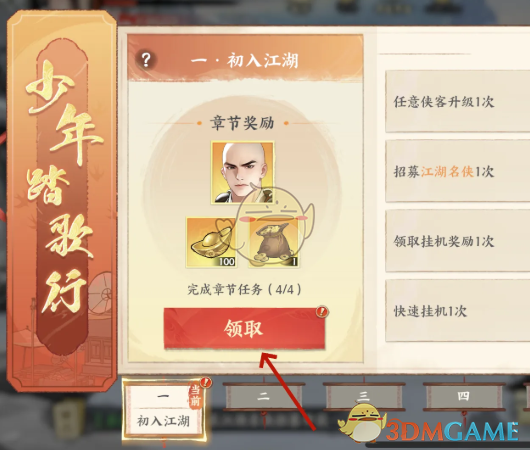 2、根据指引完成初入江湖章节任务,累计四个任务,全部达成后点击领取。