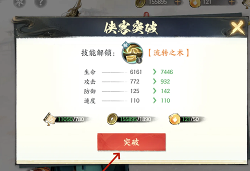 3、接着在侠客突破页面,消耗材料后点击突破按钮;