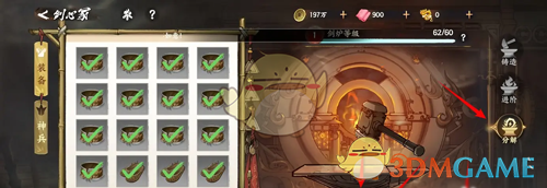 2、接着在剑心冢页面中,点击右下角的分解装备,可以一键选择需要分解的装备;