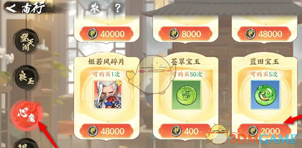 2、进入商行页面后,点击左侧的心魔找到蓝田宝玉;