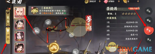 答:前往剑心冢页面点击神兵,选择升星即可完成神兵的升星操作。