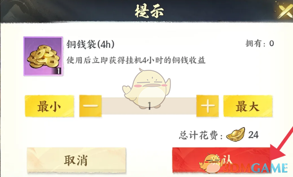 3、在购买详情页中,花费24个元宝即可完成铜钱袋的购买;