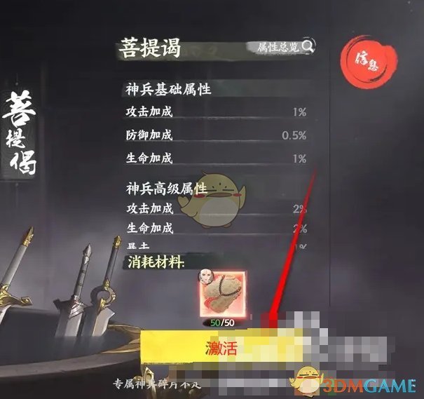 答:在神兵页面点击激活按钮,消耗碎片完成激活