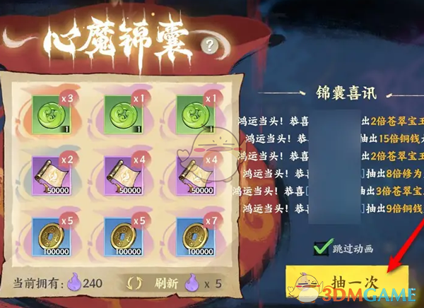 答:在心魔幻阵中找到心魔锦囊,消耗心火积分即可抽取奖励。