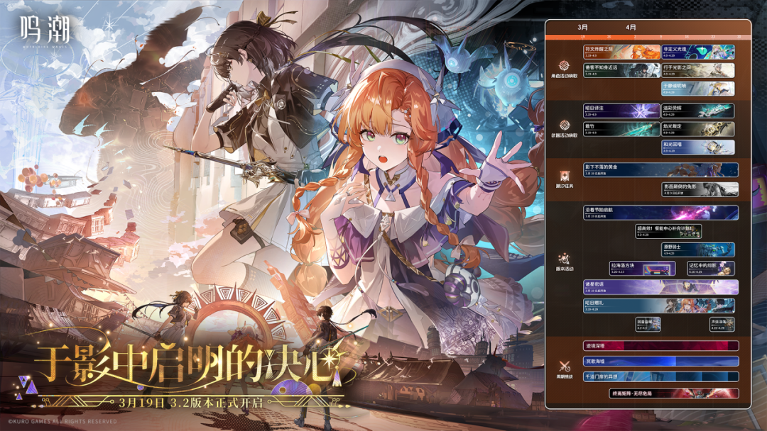 鸣潮3.2版本下半即将开启,琳奈?、赞妮?、?菲比三位人气角色将进入卡池,3.3版本前瞻也将在4月中期开启,相信很多玩家都想知道四月有哪些重要活动吧,那么下面就让小编为大家带来四月活动日历以及重点活动的详细介绍。