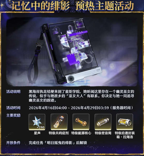 同时到了4月16日,新角色绯雪的预热活动-记忆中的绯影也将如约上线,活动时间为4月16日至4月29日, 不过给到的奖励就比较少了,只有280星声。