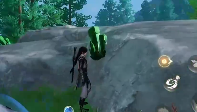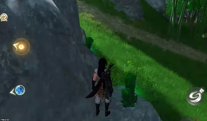 然后沿着这个位置继续向西,需要从山坡上跳下来,草坪里也会有两处岩石散发着绿色的光芒。