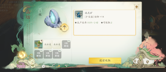 建筑产物:流光矿、盈风矿、丹烛矿、岩砂矿(可在万灵福地-长生丹炉中炼制丹药)。