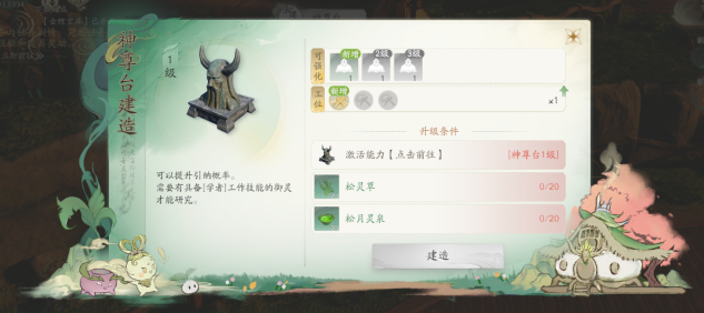 解锁条件:角色等级≥30级时,消耗先天灵元在灵根玄脉激活后,可在劝学石案位置消耗材料建造。