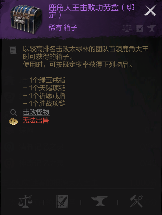 若对鹿角大王造成高额伤害,它会在重伤之下"破防",掉落功劳盒,可按概率获得绿玉戒指、天赐项链、祈愿戒指、战胜项链等战利品哦。