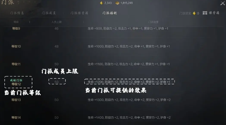 在加入门派之后,玩家可以享受五千点生命数值的增加,并且还能够附带有,防御力数值增加七点,以及攻击力增加七点的效果,随着门派等级的提升,该效果的倍率,也会逐渐加强,最高为生命数值增加15000点。