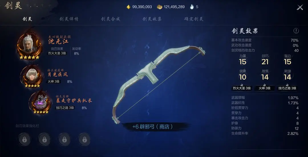游戏里的剑灵有主副之分,主剑灵的效果能更直观地体现在攻击中,而给弓介绍的主剑灵以上三者选一皆可,因为他们的灵魂剑刃效果都是烈火大圣,这也是弓职业毕业最佳效果,它不仅可以直接对怪物造成百分比数值的伤害,还可以直接增加弓的命中率,对远程职业来说最害怕的就是boss身上跳出的Miss提醒,有了这三个得力悍将,箭箭到肉就不再是梦了。