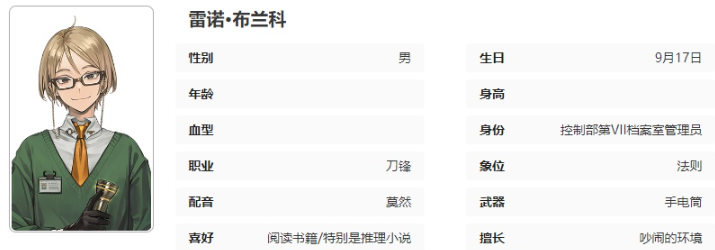 出生时被控制部构造科执行链接封装在应对局内部完成基础教育后主动申请担任控制部档案室的档案管理员,最终被分配到第VII室。