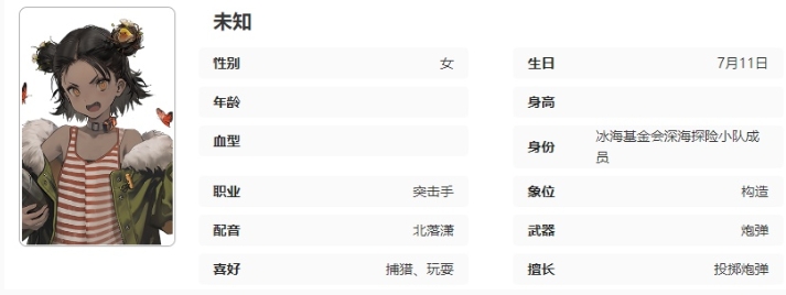 曾被困在冰层中,被冰海基金会发现并解救。作为补充战力加入唤海人的小队。