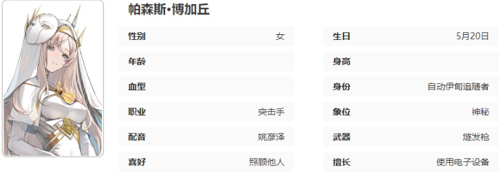 自动伊甸的追随者,超脱者的亲随,帕斯卡小姐身负宣传教义的任务跟随伊斯梅尔小姐来到应对局。出于流程曾对帕斯卡的过往进行调查,但其为人低调,没有留下值得注意的事迹,即便是在自动伊甸内部,她的存在也是不显山露水。