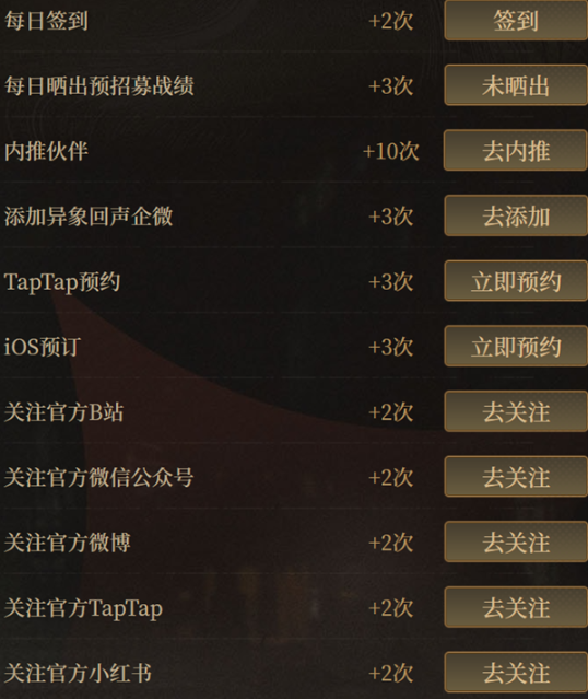 1、获取方法:完成关注、预约、邀请好友等任务即可获得对应的次数。