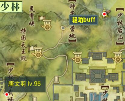 1、老少林对话【唐文羽】然后去少林后山点击蒲团拜拜获得【身轻如燕】buff;