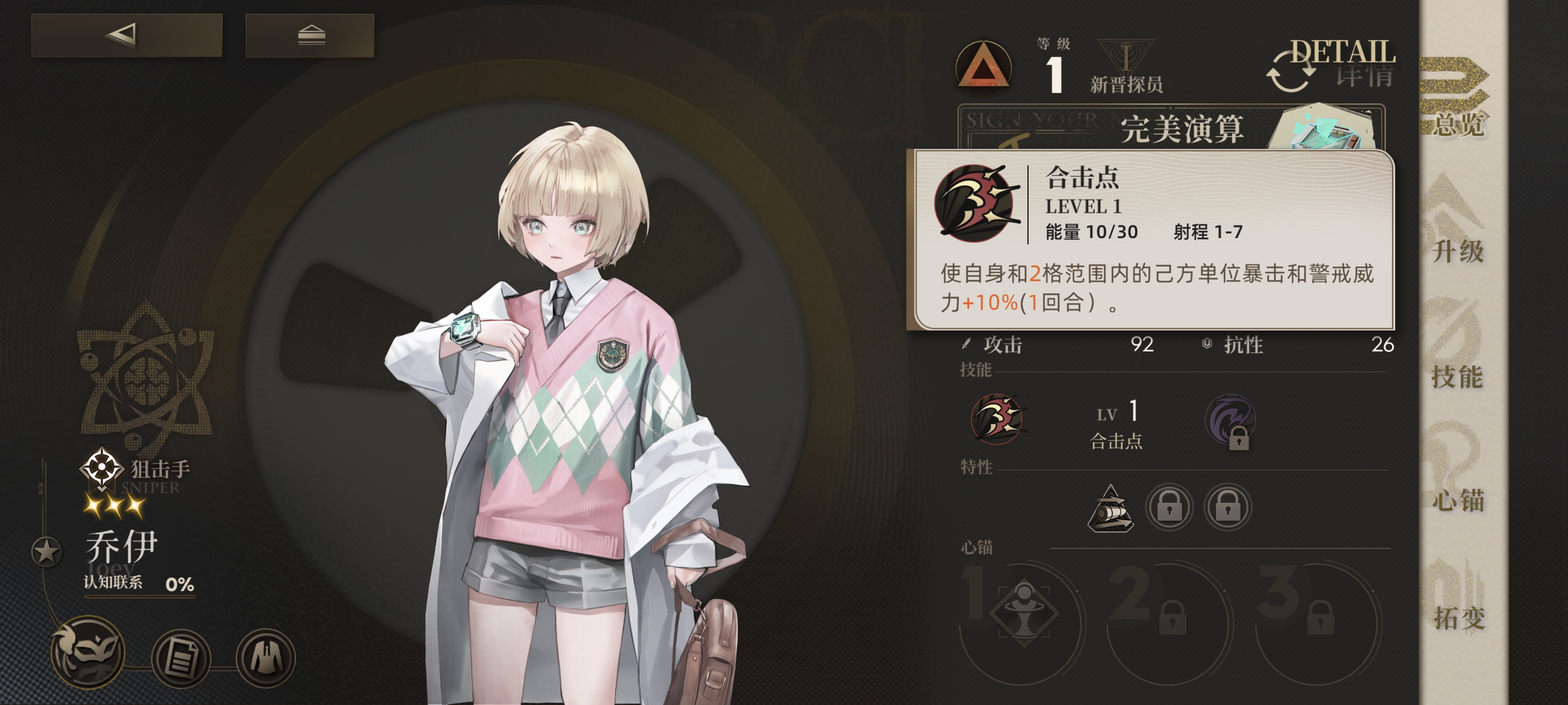 同时队伍搭配中一般只要2-3个左右的输出手即可,铃和警官的辅助位正好可以契合这种5人限额的队伍配置,甚至BOSS关去掉一个输出手换成央美,警官和玲给央美加能量促进技能周转也是不错的选择(没试过,主观臆想ing),但是三狙击BOSS关似乎更好,疯狂连击,那么这时候三星角色乔伊就有了作用,减防➕增爆,可以拐另外两个同职业狙。