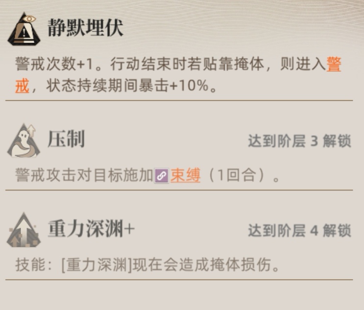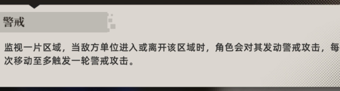 突击手模板的共同点在于其拥有的警戒范围特性。是除了反击、陷阱之外的,能够常态在敌方行动回合造成有效击杀的特性。值得注意的是,警戒攻击会受到掩体的影响,因此如果想要破除敌方的警戒攻击,可以考虑安排血量健康的角色掩体后面故意触发;同时己方的警戒范围也要注意尽量不被掩体遮挡。
