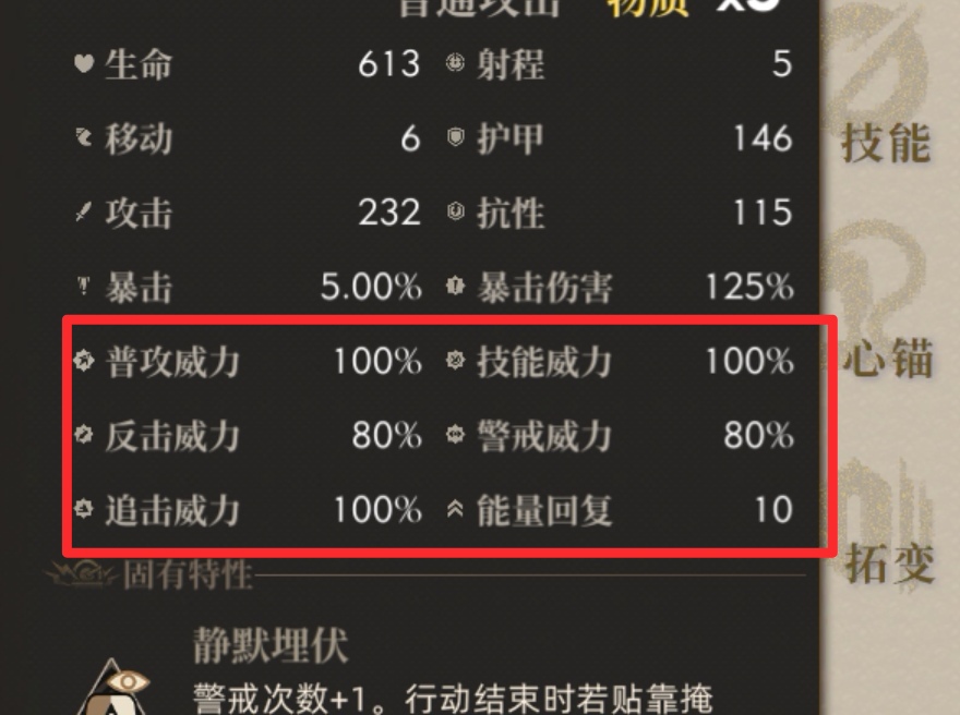 警戒威力和反击威力常态都只有80%,拓变里面还有10%的提升