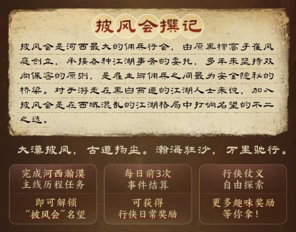披风会是河西最大的佣兵行会,由原黑榜高手雀风庭创立,承接各种江湖事务的委托,多年来坚持双向保密的原则,是雇主与佣兵之间最为安全隐秘的桥梁。对于游走在黑白两道的江湖人士来说,加入披风会是在西域混乱的江湖格局中打响名望的不二之选。