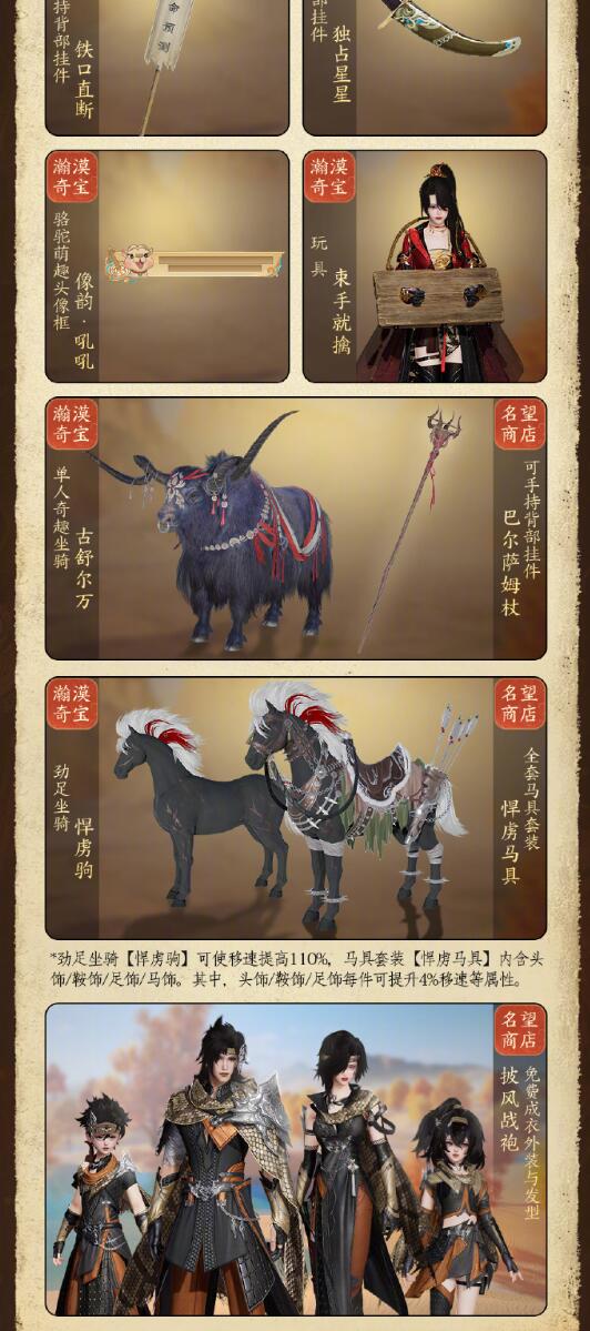 1、劲足坐骑【悍虏驹】可使移速提高110%,马具套装【悍虏马具】内含头饰/鞍饰/足饰/马饰;