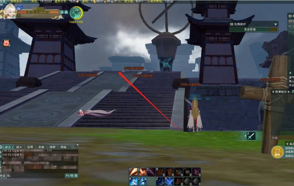 3、接着从水月宫阶梯处上去,按照箭头指示前进推进任务剧情