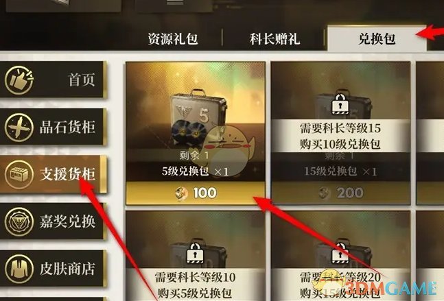 2、然后在补给站页面,选择支援货柜,找到等级兑换包;