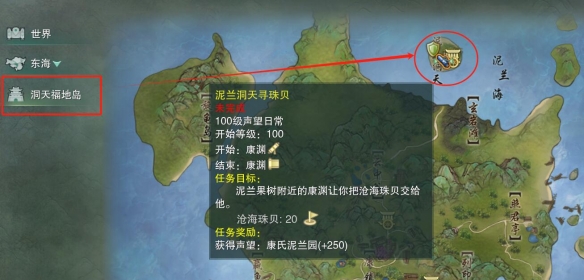 3、将【沧海珠贝】交给洞天福地岛泥兰洞天的NPC【康渊】即可;