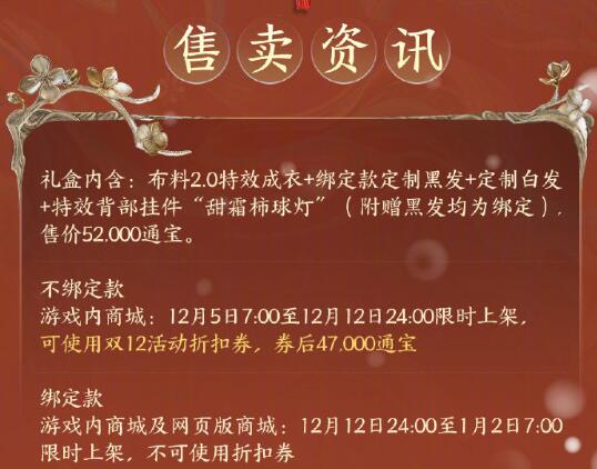 2、时装礼盒的售价为52.000通宝,购买后可以获得成衣+绑定黑发+白发+特效背部挂件甜霜柿球灯。