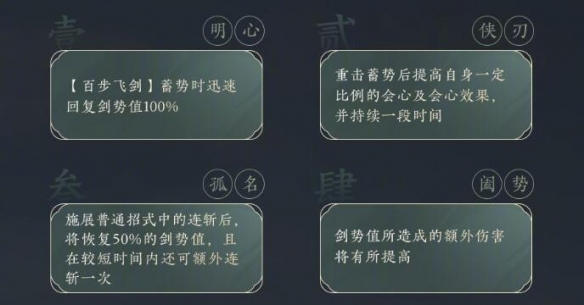 1、明心:【百步飞剑】蓄势时迅速回复剑势值100%