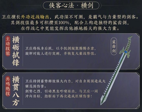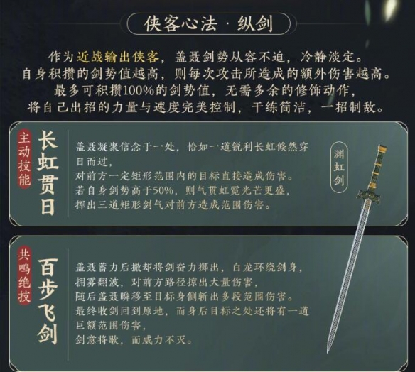 近战输出侠客,自身积攒的剑势值越高,则每次攻击所造成的额外伤害越高,最多可积攒100%的剑势值。