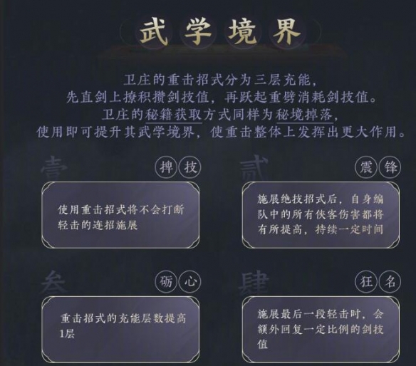 2、震锋:施展绝技招式后,自身编队中的所有侠客伤害都将有所提高,持续一定时间