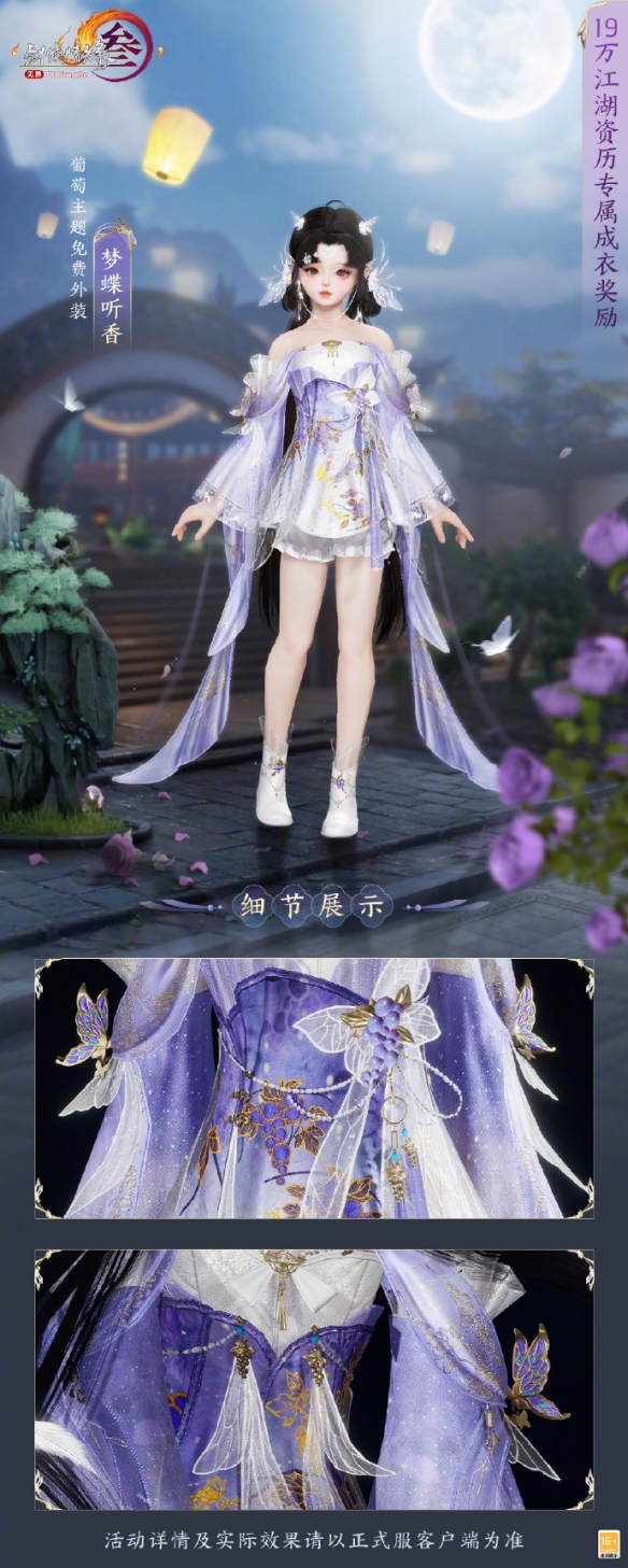 梦蝶听香会在12月23日上线游戏,很多玩家想知道成衣梦蝶听香长什么样,时装以葡萄为主题,主要的配色为紫色和白色,外观【梦蝶听香】为免费时装,是19万江湖资历专属奖励,接下来就由小编给大家带来了详细的《剑网3》成衣梦蝶听香外观一览!