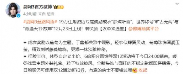 3、12月23日游戏更新后该时装将随着世界称号【旷古无两】与【奇遇天书·故年】一起上线。