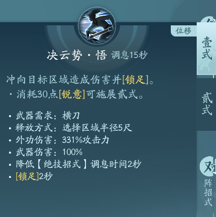 在实战中非常有用的衔接技能,PVP建议点绝篇缴械对手,PVE点秘章增伤。
