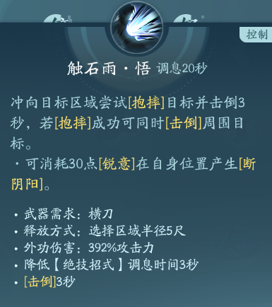 偏向PVP的技能,拥有抱摔控制的buff,如果PVE选择这个技能建议点秘章秘籍返还5s调息。