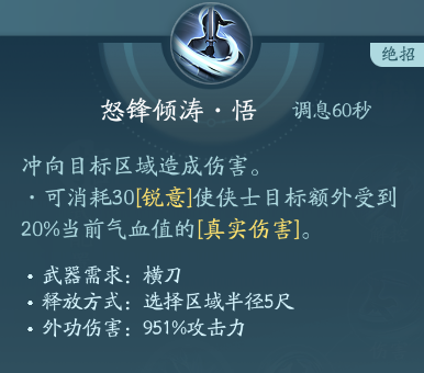 伤害超高的PVP技能,可控制可减疗,对方有奶可以点秘章,对方有化劲外功猛男可以点绝篇。