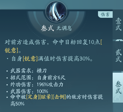 移动端刀宗唯一的增益技能,搭配秘籍可以增伤或牵制拉扯回复。PVP建议点绝篇,PVE点秘章。