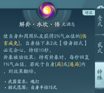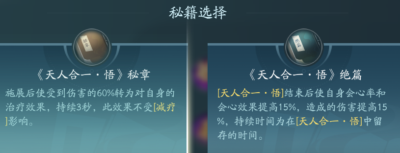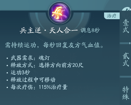 纯PVP技能,PVE刷老本的时候可以带上奶自己两口,在天人合一下释放三星临/天斗旋和兵主逆可以给友方回血。PVP点秘章回血,PVE点绝篇增伤。