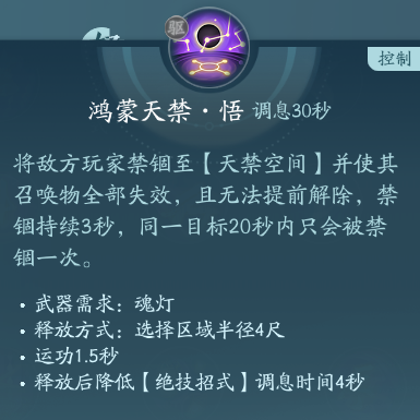 把敌人直接关进小黑屋3s,纯PVP技能,建议PVP实战中点秘章,3s不一定能把人在小黑屋里打死,但是放出来就不一定了。