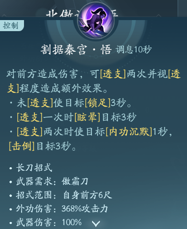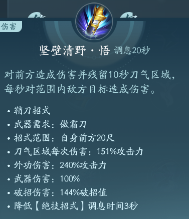 传说中霸刀能劈出三室一厅的技能,可以劈出一条刀墙分割战场也可以隔开敌人和自己的位置,保奶首选技能。PVP点绝篇,PVE点秘章。