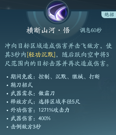超高范围伤害,主要PVP输出技能。PVP两个秘籍都能点,pve可以点绝篇。
