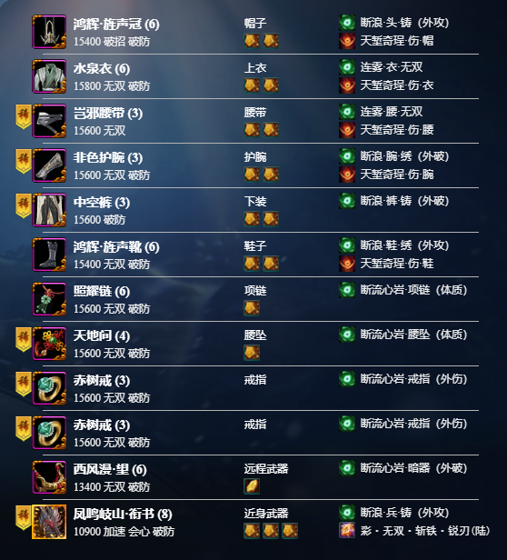 常规竞技场毕业装,苍云与会心联动属性少,因此选择主破,提高buff破防收益。