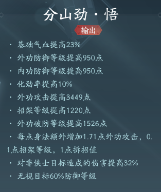 分山劲为外功近战心法,根据属性图可知苍云的主属性为身法,提高身法可以加外功攻击和招架以及拆招,配装方面可以通过堆身法来增加攻击伤害。